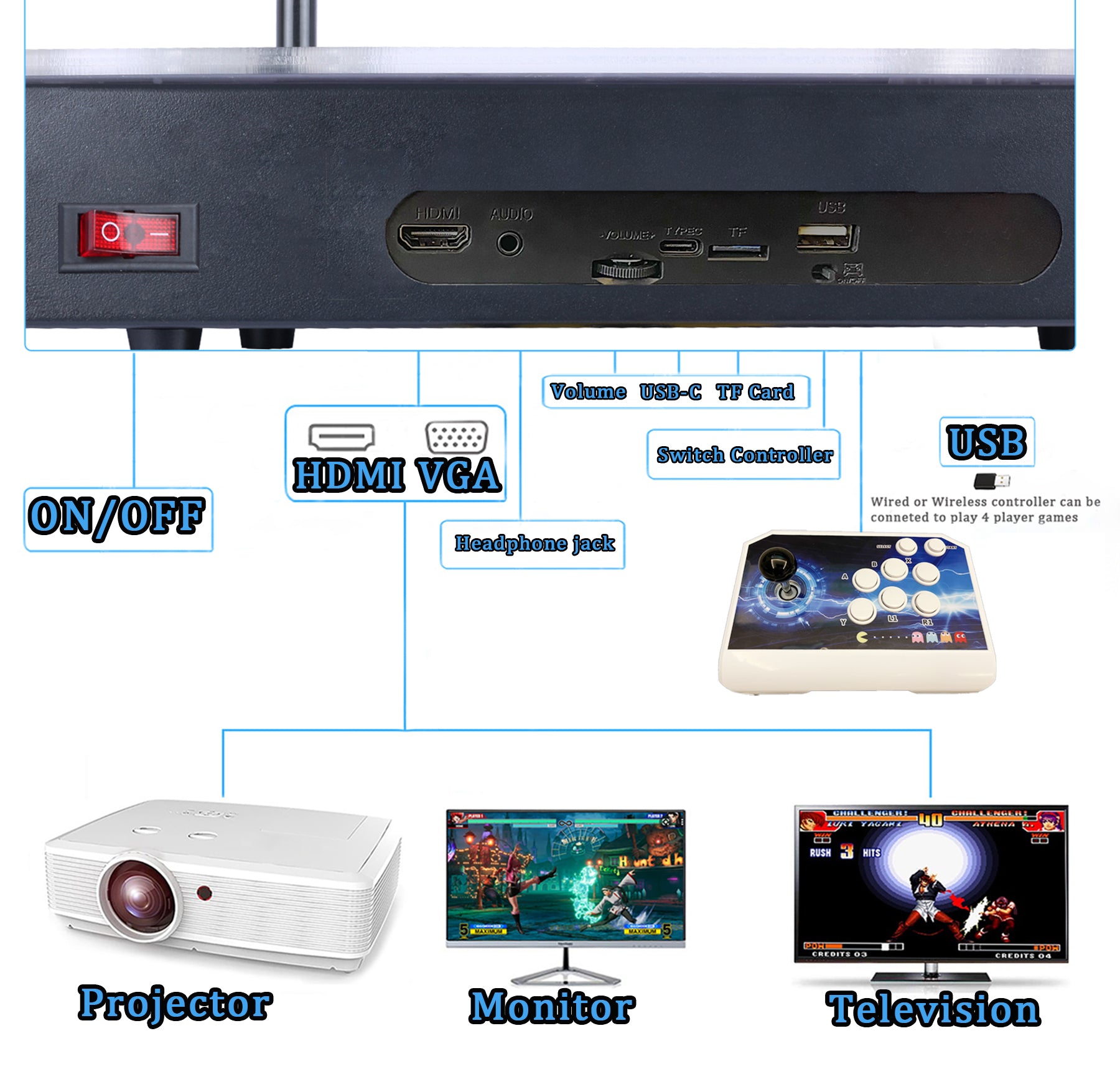 - š® ćWide CompatiblećConnect your arcade game console to any modern display device with ease, using our included VGA, HDMI cables. Suitable for 4K TV, PC monitor, and projector, ensuring a high-quality gaming experience.